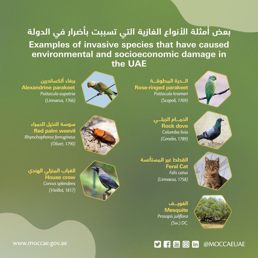 ووفقا لوزارة تغير المناخ والبيئة بدولة الإمارات، فإن هناك عدد من الأنواع الغازية الحقت ضررار في الدولة، وذكرت منها (الحمام الجبلي – الغويف – الغراب المنزلي الهندي – سوسة النخيل الحمراء – الدرة المطوقة – ببغاء إلكساندرين – القطط غير المستأنسة)