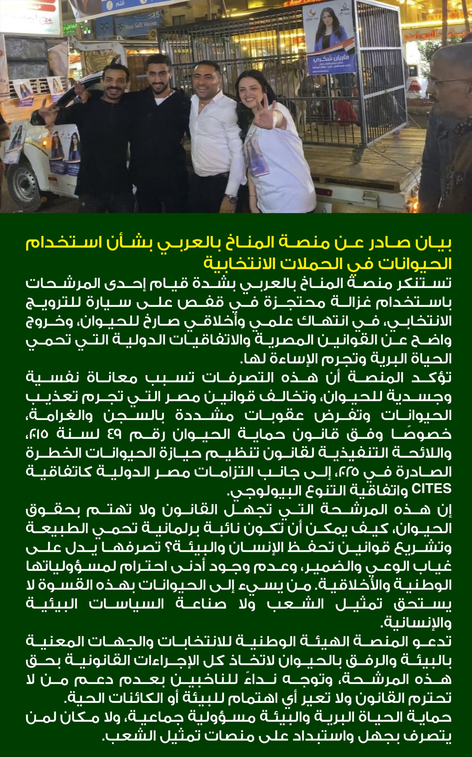 كما توجه نداءً للناخبين بضرورة رفض المرشحين الذين يستهينون بالأخلاقيات البيئية والقانونية، لأن حماية البيئة والحيوان منظومة حيوية لحماية وطننا ومستقبل أجيالنا.