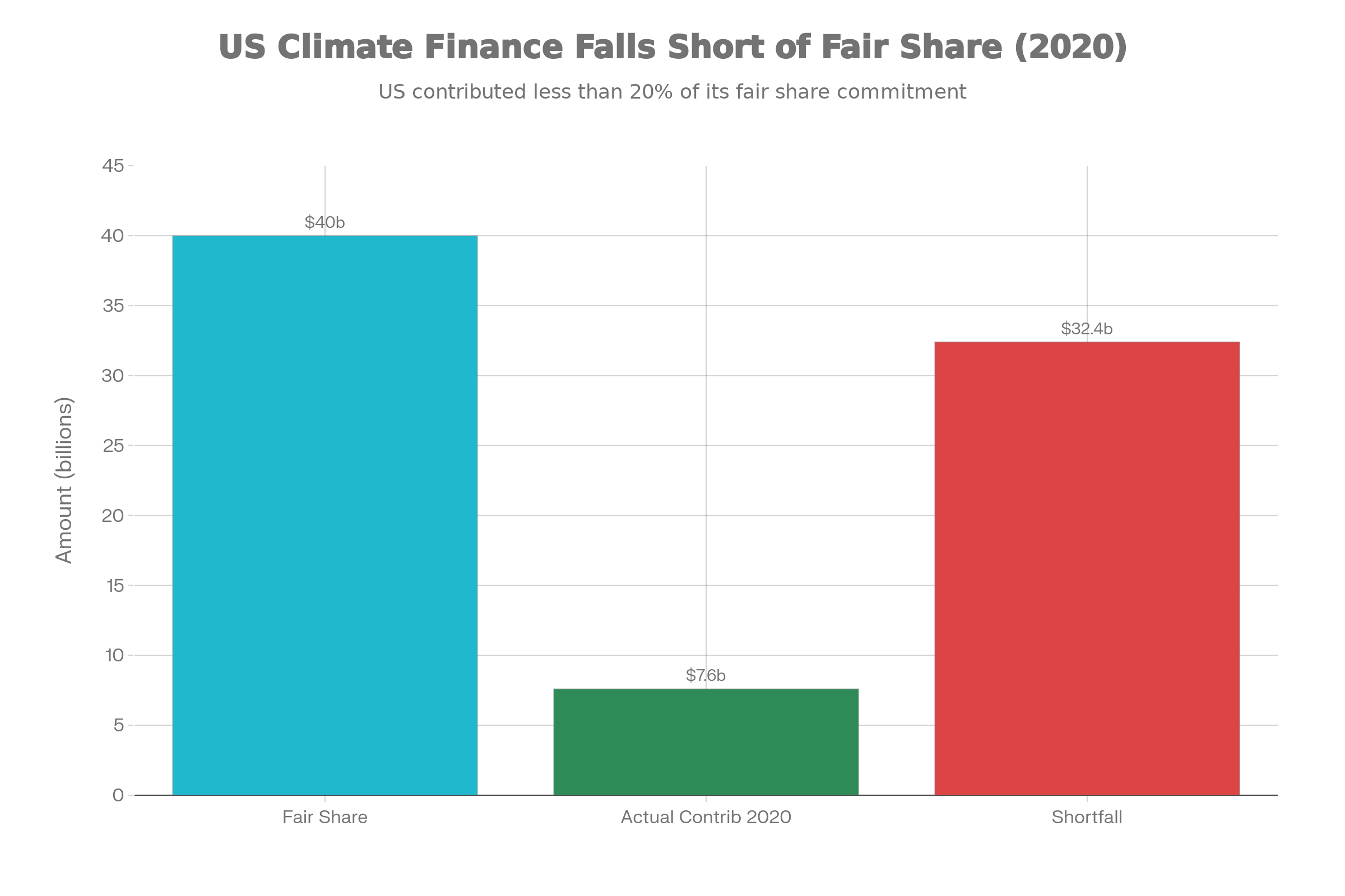 البيانات أعلاه توضح الفجوة الحادة بين الحصة العادلة للولايات المتحدة (حوالي 40 مليار دولار سنويًا بناءً على مسؤوليتها التاريخية عن الانبعاثات) وما قدمته فعليًا (7.6 مليار دولار في 2020).
